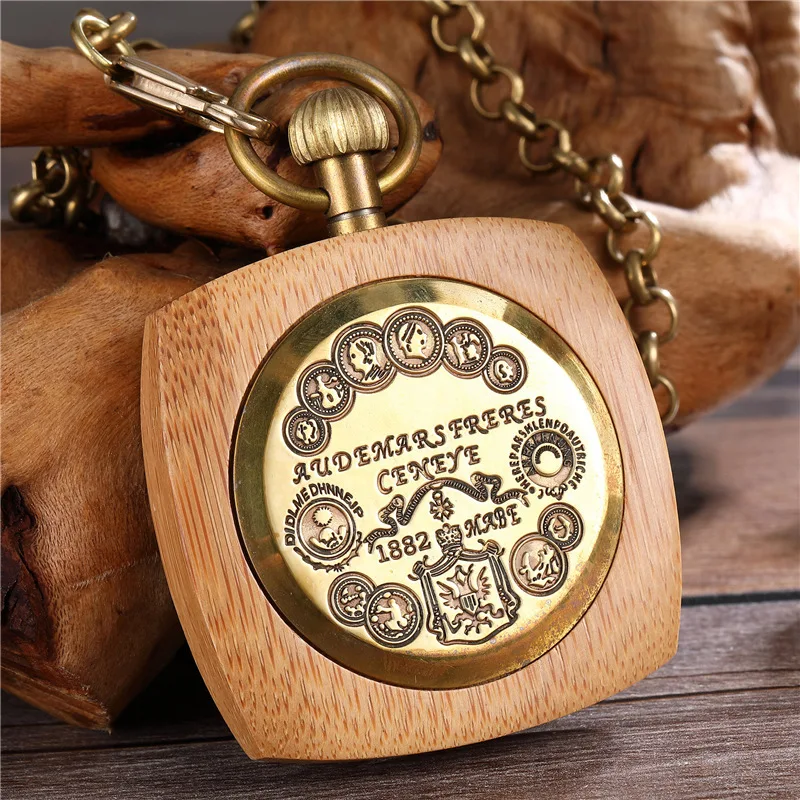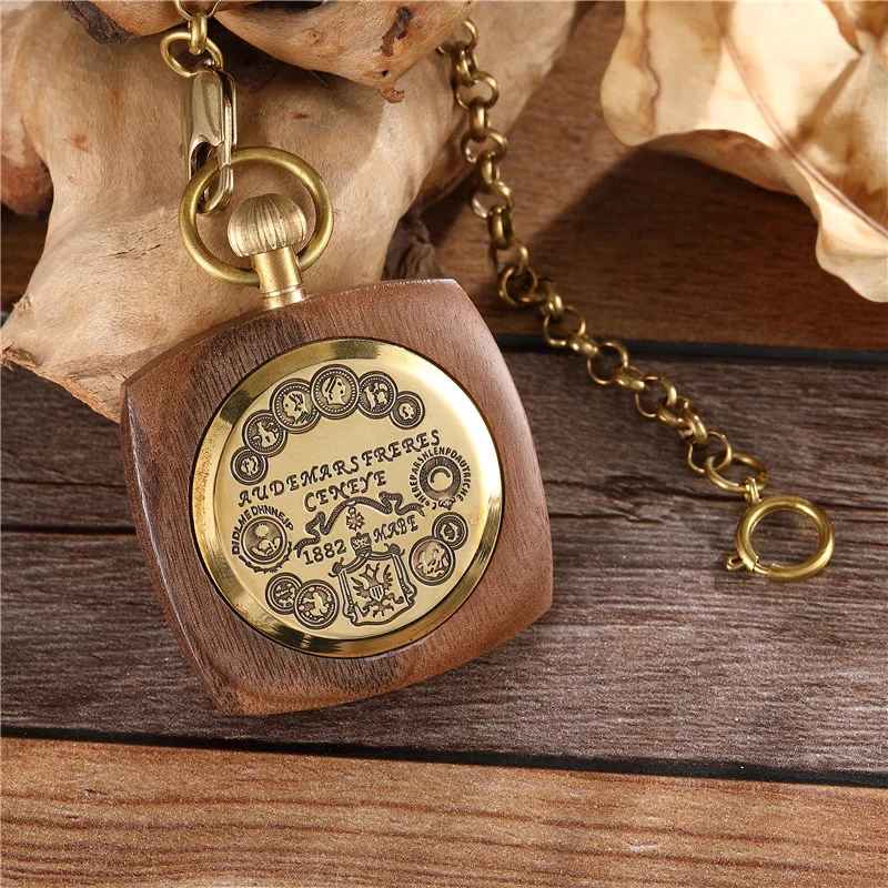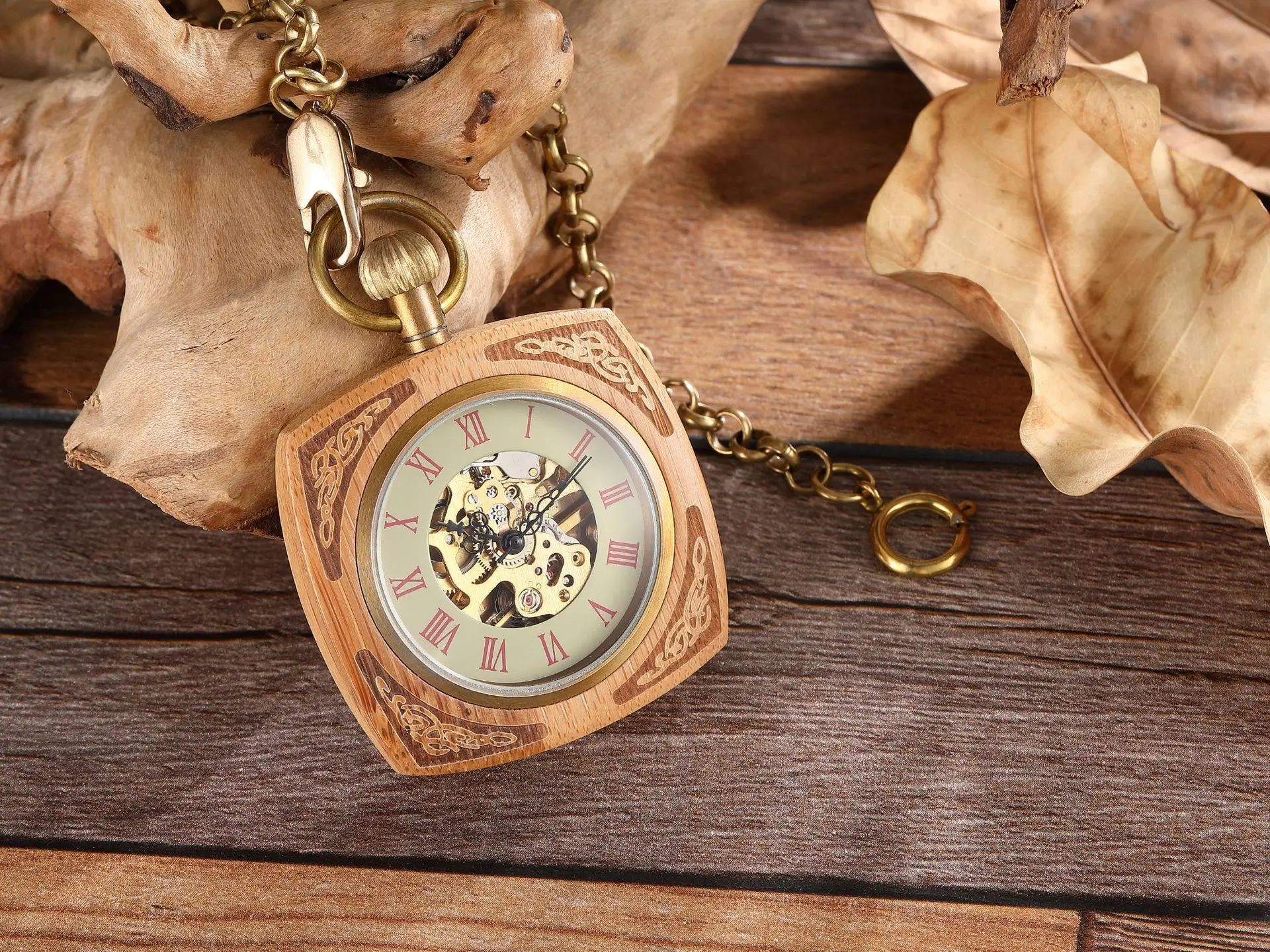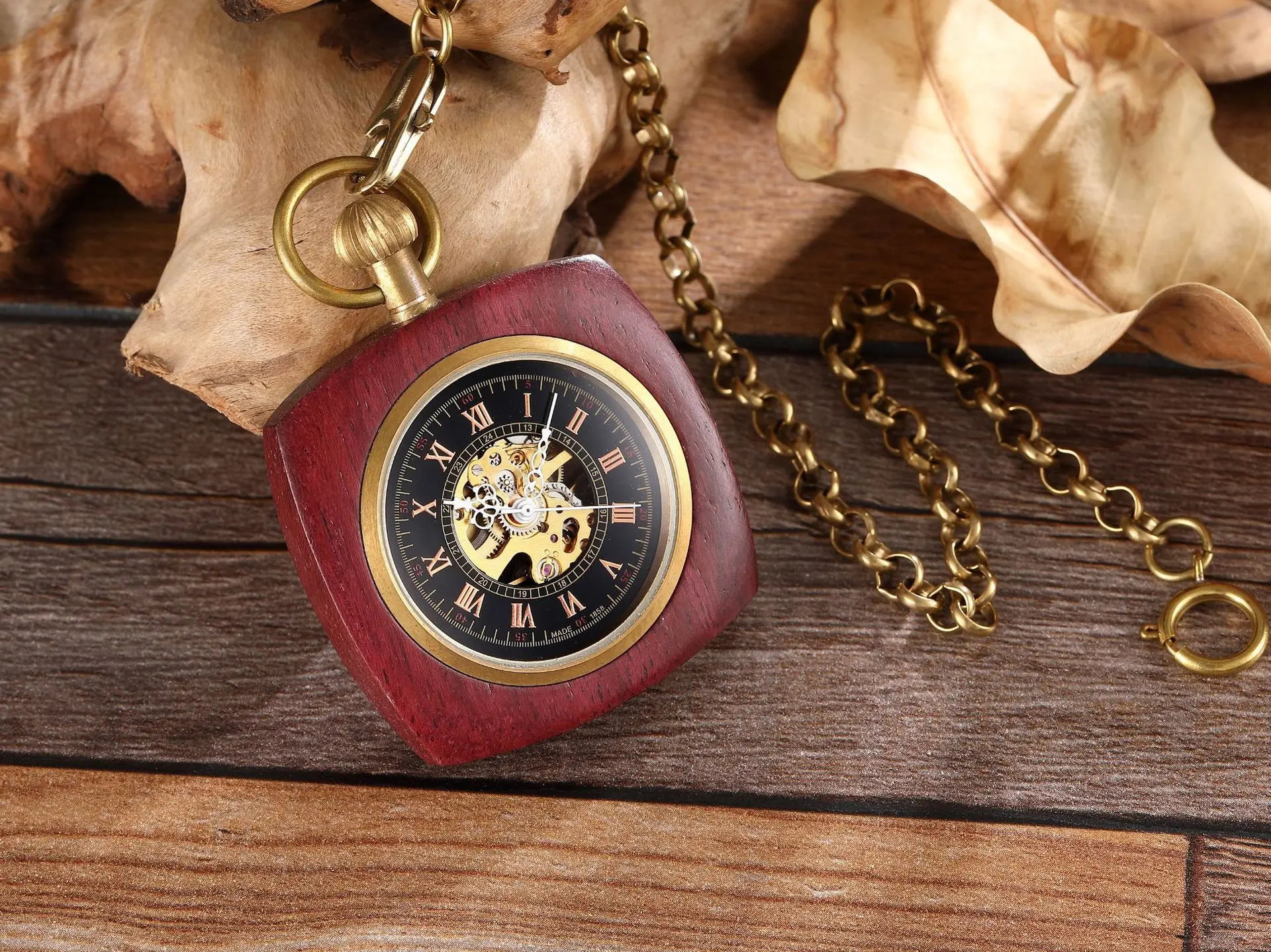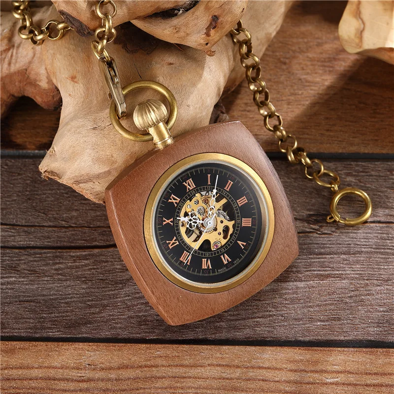 10 قطعة/الوحدة ريترو خمر الخشب الفاخرة الميكانيكية ساعة جيب اليد الرياح الهيكل العظمي ساعة الجيب مع سلسلة بالجملة